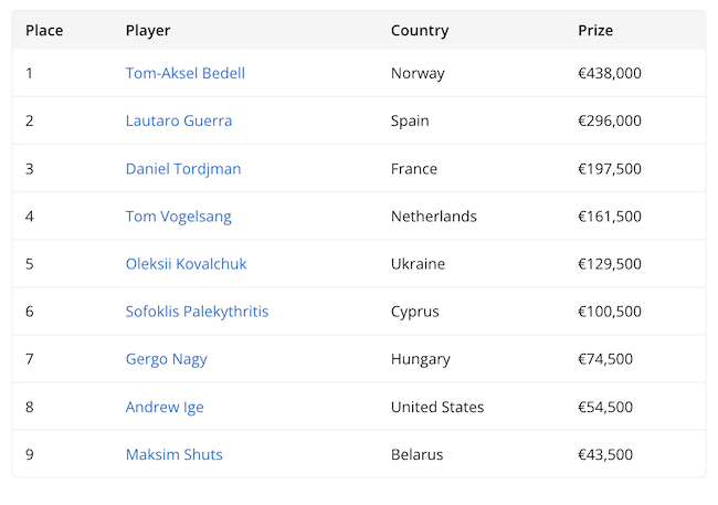L’alto livello del torneo è confermato, buy-in a parte, dalla presenza al final table del già citato Tom Vogelsang, di Oleksii Kovalchuk (2 titoli WSOP per l’ucraino) e del pro ungherese Gergo Nagy. Scorrendo il payout, dopo le prime 10 posizioni troviamo i tedeschi Ismael Bojang e Max Kruse, entrambi hanno in bacheca 1 titolo WSOP/WSOPE, e il nostro Dario Alioto, vincitore di un titolo Omaha alle WSOPE nel 2007.