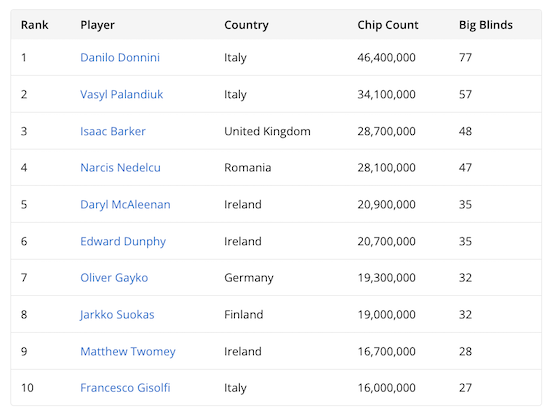 Il fanalino di coda è invece un altro italiano, Francesco Gisolfi con 16.000.000 di chip. Questa è la top 10 all’inizio del Final Day: