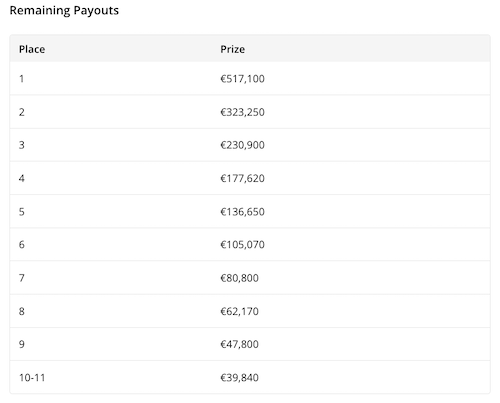 Nello stesso periodo di gioco, gli italiani Manuel Ferrari (21°, €18.250) e il già citato Luca Bernardi (15°, €27.710) hanno salutato il torneo. A sancire la fine dei giochi è stata l’eliminazione del rumeno Cristian Ivanus (11°, €39.840).