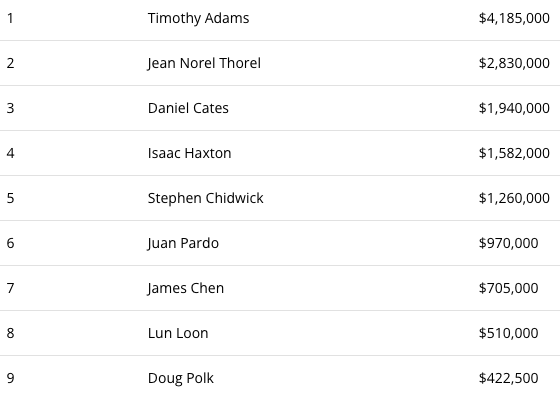 Timothy li ha messi in fila tutti, per un primo premio superiore a quello conquistato 4 anni fa. Questo è il payout finale: