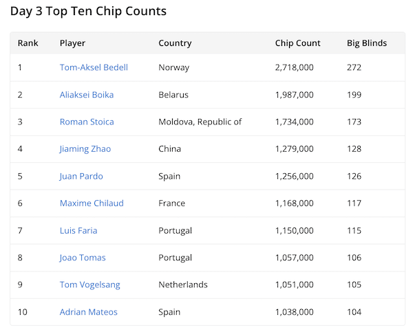 In sala sono rimasti 36 giocatori su 135 qualificati dal Day 2. Al comando troviamo Tom-Aksel Bedell, torneista veterano (128 itm a partire dal 2008) e n. 4 della All Time Money List norvegese, con 2.718.000 chips imbustate a fine Day 3. Bedell, che vanta una vittoria da $709.000 alle Triton Poker SHR Series 2025 di Jeju, ha conquistato la testa del torneo nel livello 19 (5.000/10.000 bb ante 10.000), eliminando il grinder macedone Ilija Savevski.