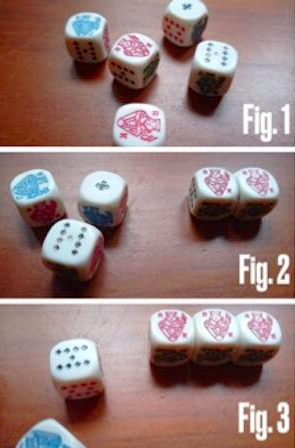 Dopo il secondo lancio, il processo si ripete. Il giocatore può decidere di tenere qualunque dado rilanciato, mettendolo accanto a quelli del primo lancio e lanciando nuovamente gli altri. Nel nostro esempio, il giocatore ha ottenuto un altro re: ovviamente ha tenuto, per poi lanciare ancora una volta gli altri due dadi (fig. 2).