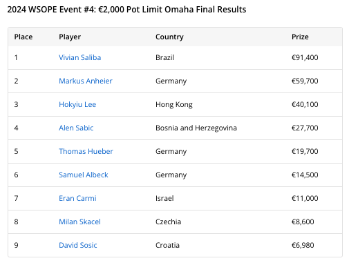 L’attesa di Vivian Saliba è durata due giorni, duranti i quali è riuscita a lasciarsi alle spalle la concorrenza di ottimi giocatori, quali Vladimir Troyanovskiy, Gabi Livshitz, Thomas Eychenne e Kai Lehto, e anche di grandi specialisti del Pot Limit Omaha. Due nomi su tutti in questa categoria: Yan “Anson” Tsang, due volte vincitore di questo torneo (WSOPE 2018 e 2022), e il campione in carica Hokyiu Lee.