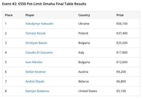 Sulle ali dell’entusiasmo (e della good-run) per lo scampato pericolo, Volodymyr Kokoulin ha poi regolato Hristiyan Banov al 3° posto e Tomasz Kozub nell’heads-up, per un braccialetto WSOPE che vale €56.100.