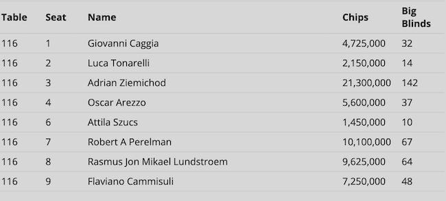 A guidarli c’è Adrian Ziemichod, secondo al termine del Day3 e protagonista ieri di una gara che lo ha visto sempre nelle zone altissime del count. Il polacco ha imbustato la bellezza di 21.300.000 chips, più del doppio del secondo in classifica: il reg americano Robert A. Perelman che ha chiuso la giornata con uno stack di 10.100.000.