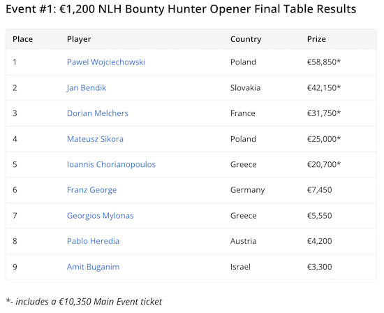 A mettere la prima firma sulla rassegna è stato Pawel Wojciechowski. Il polacco ha battuto in heads-up il veterano Jan Bendik, campione Main Event EPT a Montecarlo nel 2016. Wojciechowski ha incassato 58.850 euro – secondo miglior risultato in carriera – il primo braccialetto della serie e soprattutto il ticket da €10.350 per il Main Event in programma a ottobre. Il n.1 slovacco si è invece consolato con €42.150.