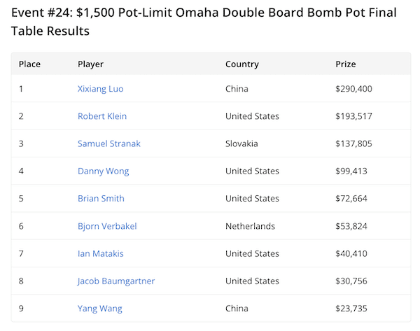 Ha vinto il player cinese Xixiang Luo, uno specialista di mixed game, che ha così collezionato il terzo braccialetto WSOP. Nel 2024, oltre alla vittoria nel $25K High Roller di H.O.R.S.E., Luo si era imposto proprio nel $1.500 Mixed NLH/PLO Double Board Bomb Pot: il suo è quindi un eccezionale back-to-back realizzato con questa giovane variante di poker!