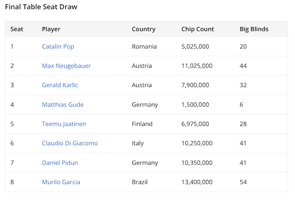 Claudio Di Giacomo inizierà il Final Day oggi alle ore 16:00 con il quarto stack. Al comando si è piazzato il brasiliano Murilo Garcia Pedroso, inseguito a poco distanza da Max Neugebauer, già campione del WSOPE Main Event nel 2023. Il tedesco, ex giocatore di basket e autore ieri di una prova molto solida, ha così raggiunto Jason Mercier e Daniel Negreanu a quota tre final table ME WSOPE. Tuttavia, in caso di vittoria, diventerebbe il primo giocatore a poter vantare due vittorie nel torneo più importante delle World Series Of Poker Europe.