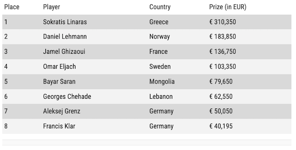 La volata per il titolo (Day4) si è conclusa con la vittoria di Sokratis Linaras. Il greco ha superato nel testa a testa finale il norvegese Daniel Lehmann, chipleader al termine del Day3, mettendo in mostra alcune buone giocate. In particolare l’ultima, quella che gli ha consegnato il braccialetto e €310.350 di primo premio.