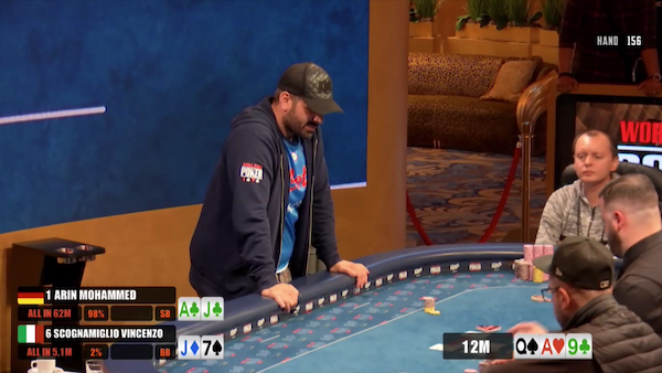 Ma è ancora dura, perché l’azzurro arriva alla fase 4-handed con solo 4 bb. Buon per lui che, prima di dover pagare un altro buio, il tedesco Arin Mohamad elimini l’altro shortstack, David Pal, con coppia di 10 vs A♠6♣: il flop porta un 6♦, ma il resto del board è liscio e garantisce a Scognamiglio almeno la terza piazza.