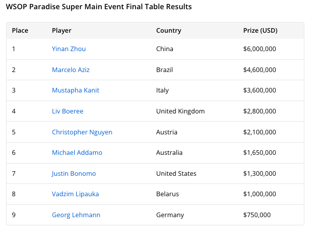 Ieri è successo un po’ di tutto al final table del Main Event WSOP Paradise. Ha vinto un giocatore praticamente sconosciuto ma capace di grandi giocate, alcune delle quali a danno dei suoi idoli pokeristici. C’è stato un nuovo primato femminile. L’Italia è salita sul podio, ma con qualche rimpianto per una vittoria tanto attesa quanto sfiorata. I nomi dei protagonisti di questi tre capitoli sono nell’ordine: il cinese Yinan Zhou, la britannica Liv Boeree e l’italiano Mustapha Kanit.