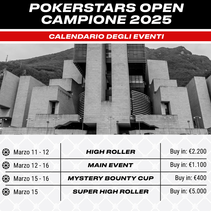 | 15 marzo (Sab) | 18:30 | #18 (1/B) | PokerStars Open Mystery Bounty Cup – 20 Min Levels – Unlimited Re-Entry | €400 | 30.000 |