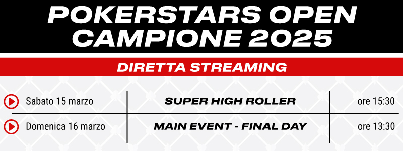 | 12 marzo (Mer) | 19:00 | #6 (1/B) | PokerStars Open Main Event – 30 Min Levels – Unlimited Re-Entry | €1.100 | 30.000 |