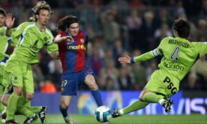 Xavi lavora con la consueta maestria un pallone difficile a pochi passi dal cerchio di centrocampo, nella propria metà campo. Accanto a sé vede e serve Messi, che quel giorno
