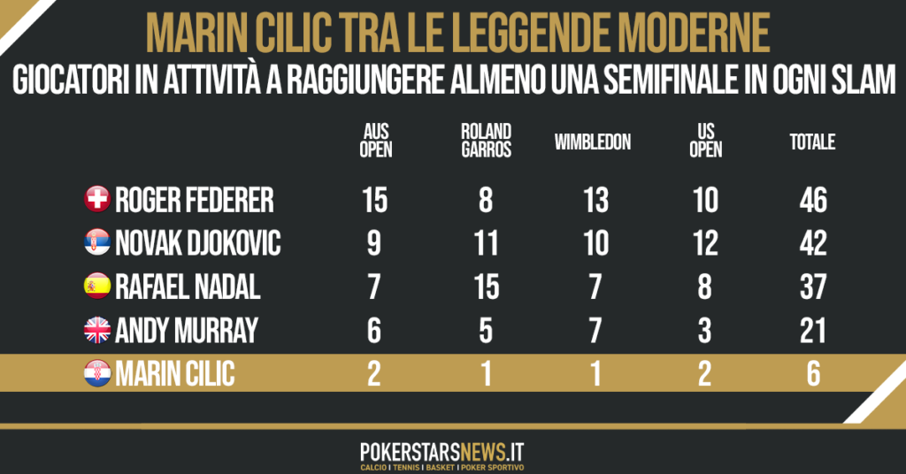 Con la semifinale del Roland Garros, Cilic non ha soltanto spezzato una lunga astinenza di risultati di spicco negli Slam, ma è diventato anche il quinto giocatore in attività a essersi spinto così in fondo in almeno un’occasione sui grandi palcoscenici di Melbourne, Parigi, Londra e New York (6 complessive).