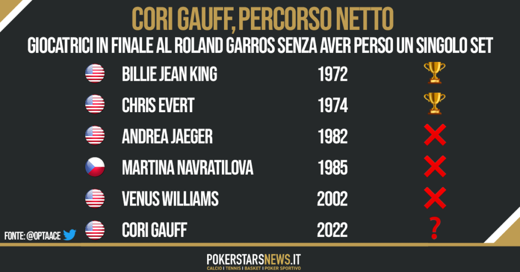 Nella storia ultracentenaria del Roland Garros, soltanto 6 giocatrici hanno raggiunto la finale con percorso netto, senza concedere alcun set alle avversarie. Cori Gauff, attesa a sfidare Iga Swiatek sabato 4 giugno nel match per il titolo, si infila in questa lista super-esclusiva affiancando grandissime leggende del tennis internazionale.