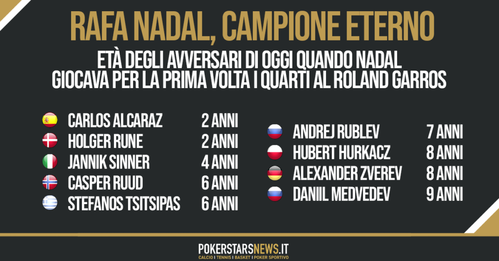 Il più “vecchio”, Daniil Medvedev, attuale numero 2 del mondo, ne aveva 9. Il nostro Jannik Sinner soltanto 4. E i nuovi teenager terribili, Holger Rune e Carlos Alcaraz, già pronto a seguire le orme del grande maestro Rafa, avevano spento solamente due candeline sulla torta di compleanno.